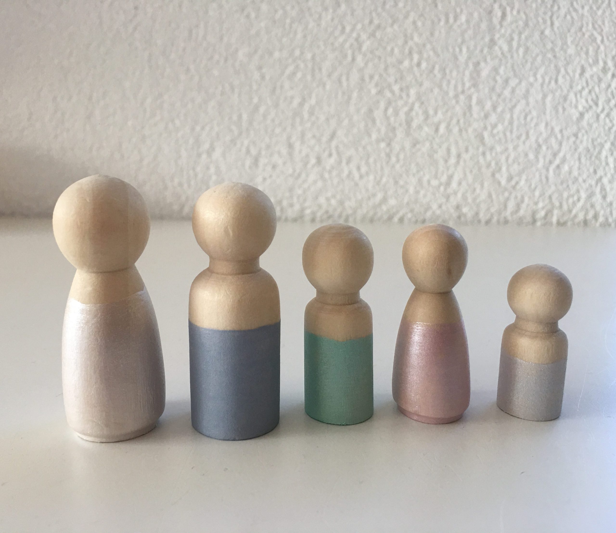 De poppetjes worden standaard geleverd in pastel kleuren: taupe (papa), wit (mamma) vintage roze (meisje) vintage groen (jongen) extra poppetjes (vintage blauw of een net andere tint roze).