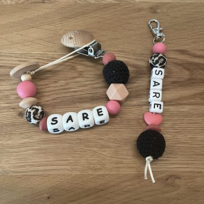 Een prachtig gepersonaliseerd speenkoord in de mooie kleurencombinatie van oud roze, zwart, koraal en de panterprint kraal. Dit hulpmiddel zorgt ervoor dat het verliezen van de speen, het knuffeltje of het speeltje tot de verleden tijd behoort. Makkelijk te bevestigen aan de kleding met de clip.